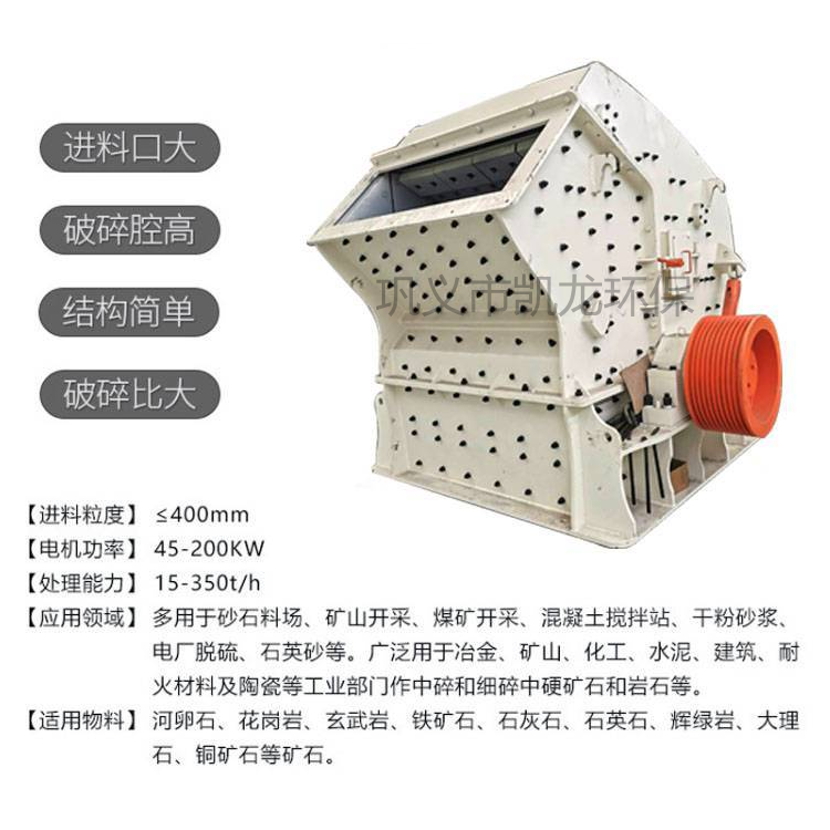 反擊式破碎機性能特點:1、反擊式破碎機適應物料范圍廣硬度高,破碎腔容積大。 2、反擊板與轉子間隙調節(jié)范圍大,調節(jié)方便。成品物料形狀好。 3、結構緊湊,安裝簡單方便。易于操作。 4、板錘、反擊板硬度高,抗沖擊、抗磨損、沖擊力大。 5、檢修方便,使用成本低,設備性能穩(wěn)定。 6.破碎比大,生產(chǎn)效率高,綜合效率高。